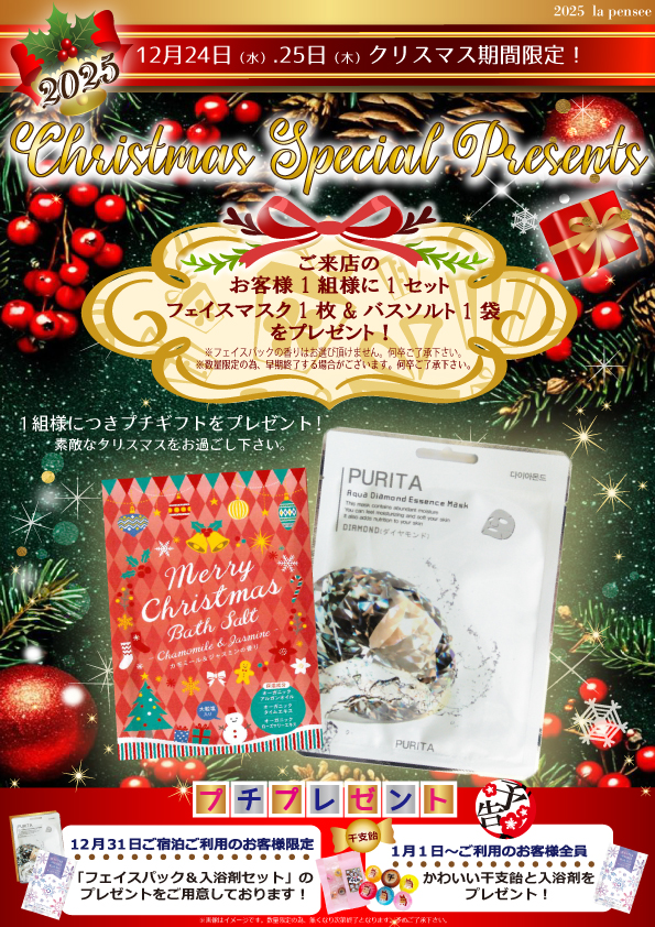 12/20~25日にご利用のお客様へ、プチギフトをご用意してお待ちしております!